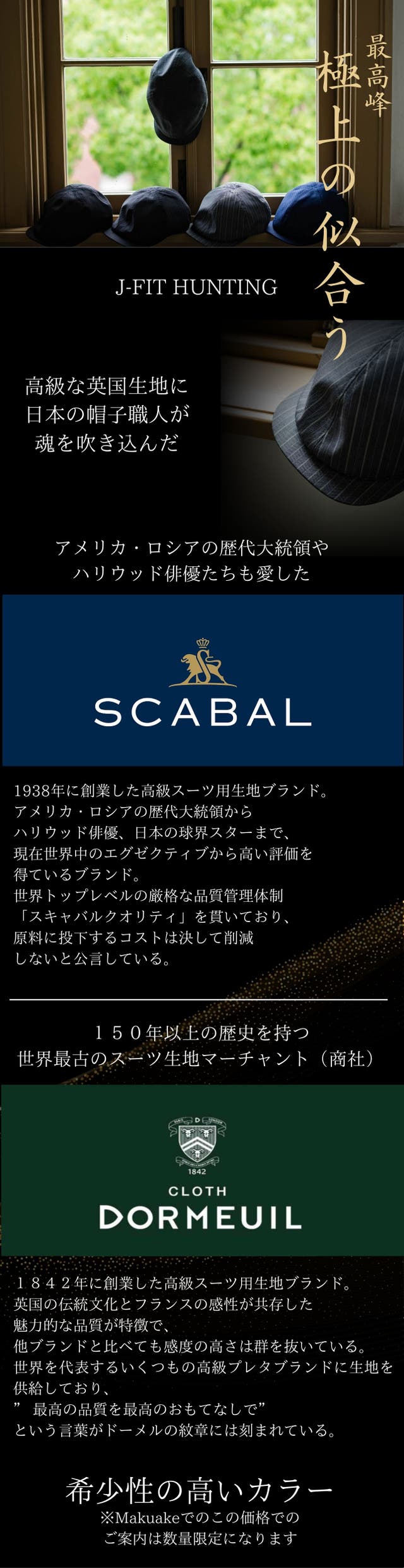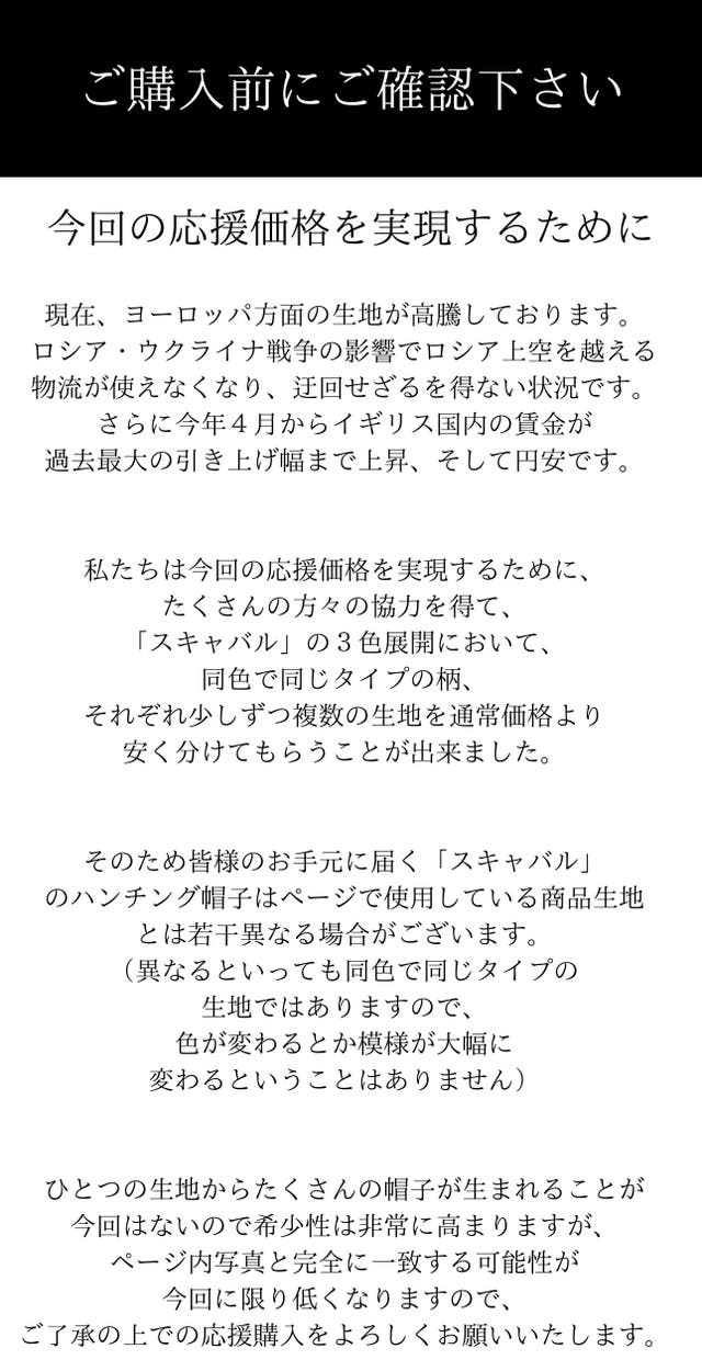※SCABALは、スキヤバル ソシエテ アノニムの登録商標です。 ※DORMEUILは、ドルムイユ フレールの登録商標です。 ※デザイン・仕様が一部変更になる可能性も御座います。 ※使用感等に関する返品・返金はお受けいたしかねますので、お手元の帽子やご自身の頭のサイズと照らし合わせながら商品をお選びいただくよう御願い致します。 ※一部国内に類似品が出回っている可能性がございます。弊社では他社の類似品に関してのお問い合わせには対応できませんので、ご了承ください。弊社商品のオリジナル性については、プロジェクト本文の情報をご覧ください。 ※応援購入の数が想定を上回った場合、製造工程上の都合、配送作業等により出荷時期が遅れる場合が御座います。 ※本文中に記載させていただいたスケジュールは、あくまでプロジェクト公開時点の予定です。応援購入の性質上、配送遅延のおそれがございます。原則として、配送遅延に伴う応援購入のキャンセルはできませんが、リターン配送予定月から3ヵ月を超えた場合には、希望者に限りキャンセルにて対応させていただきます。 以上の注意点につきましてあらかじめご理解とご了承いただいた上でご応援購入してくださいますよう、よろしくお願い申し上げます。 皆様に喜んで頂けるよう、心を込めて対応していきます。応援よろしくお願い致します.