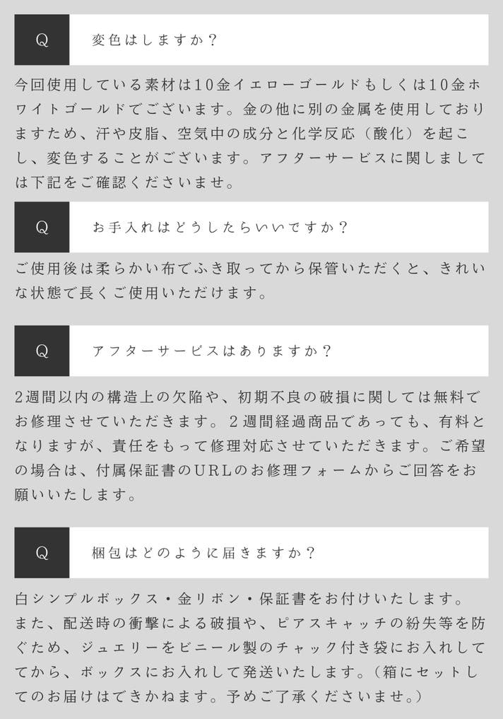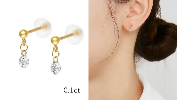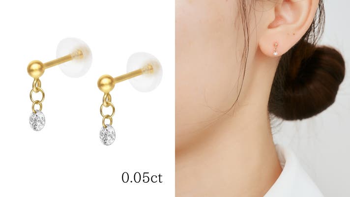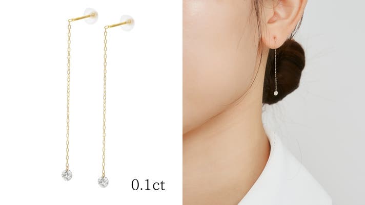 K10イエローゴールドとK10ホワイトゴールドの2色展開で、肌のトーンやファッションに合わせてお好みの雰囲気を楽しめます。