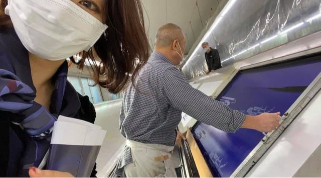 職人さんに一枚ずつ手捺染で染めていただきます。