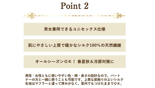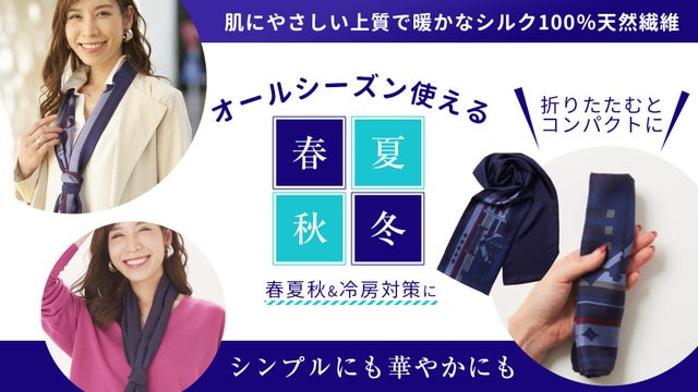 このスカーフなら、春・秋・冬の防寒対策はもちろん、夏の紫外線対策や冷房対策としても年間を通してお使いいただけます。