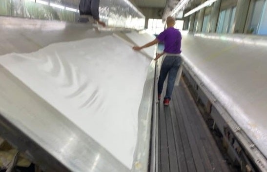 二人の動きが息もぴったり合っているため二人がきれいに重なっていますが、こうしてこのロングスカーフを手捺染で染めることができるのも職人の方々のおかげです。