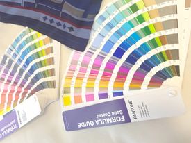 2161色のパントーン帳の中から見本となる色見本を1色選び、それを参考に数種類のネイビーの色見本をシルク生地に実際に染めていただき、加工した後のネイビーの色味や発色や光沢の違いを吟味して1色を決定しました。
