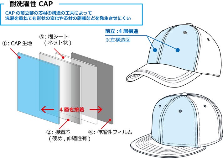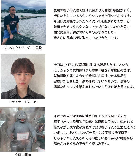 キャップと言っても様々なタイプがあり、私たちは通常洗えないタイプのキャップに着目し、洗濯機の過酷な状況下でも型崩れのしにくいタフな仕様のキャップを開発しました
