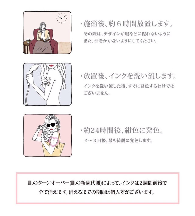 人の肌のターンオーバーは長くても1ヶ月ですので1ヶ月以内に消えます。染まりは肌質や気温・体温によって変わりますのでご了承ください。