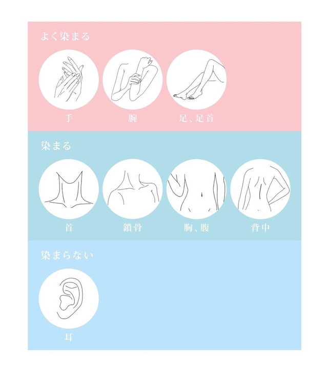 ジャグアアートはよく染まる部位、染まりにくい部位がございます。染まりやすさは、体温は肌質、気温などによっても変動します。
