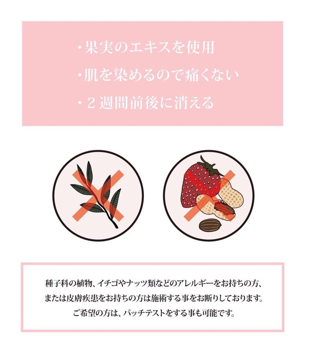 種子科の植物(ナッツ類)やバラ科(イチゴ・りんご)や成分にアレルギーがある方は施術できませんのでご了承ください。
