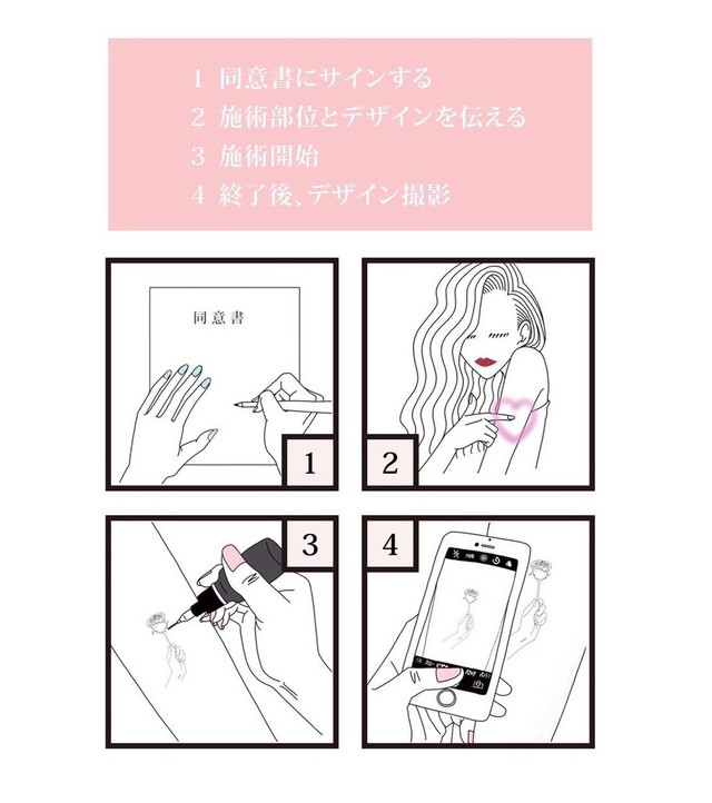 あなたの思いやストーリーを聞いた上で、線からグラデーションまで全てフリーハンドで30分〜1時間で表現させていただきます。