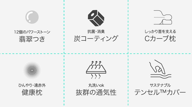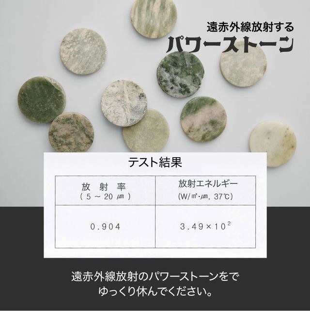 パワーストーンである翡翠が12個内蔵されており、遠赤外線放出と豊富なマグネシウム含有で睡眠中にも健康管理をサポートします。