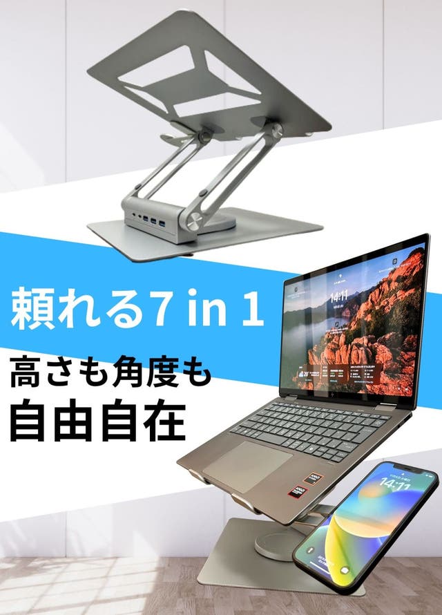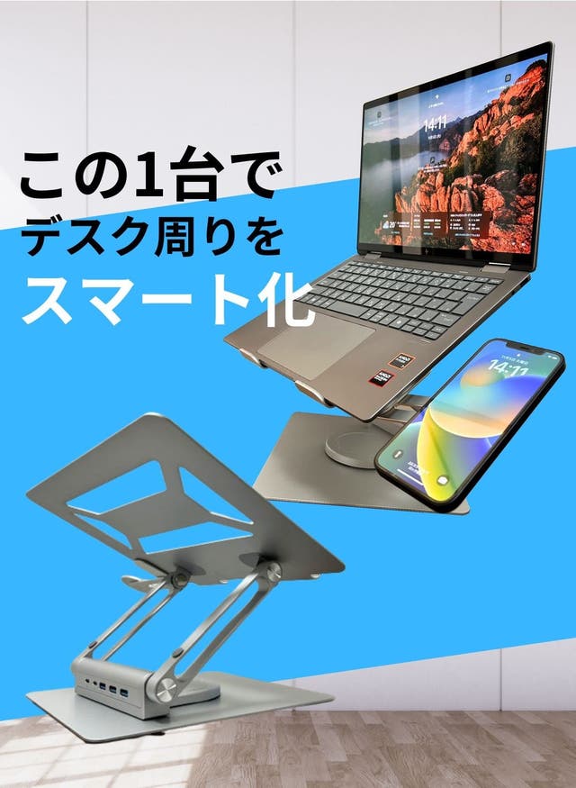 USBハブ、スマホスタンド、そして高さ調節や360度回転まで備えたオールインワンのノートPCスタンド【HubStand Pro】。