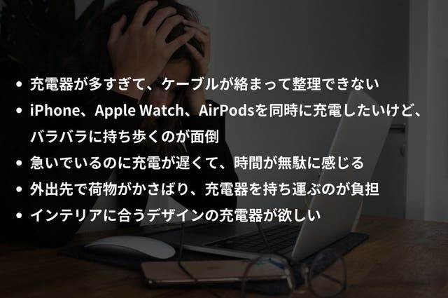 従来の充電方法ではケーブルが絡まったり、どの充電器がどのデバイスのものか分からなくなることがよくあります。この製品ならケーブル1本だけ。スマートに整理できます。