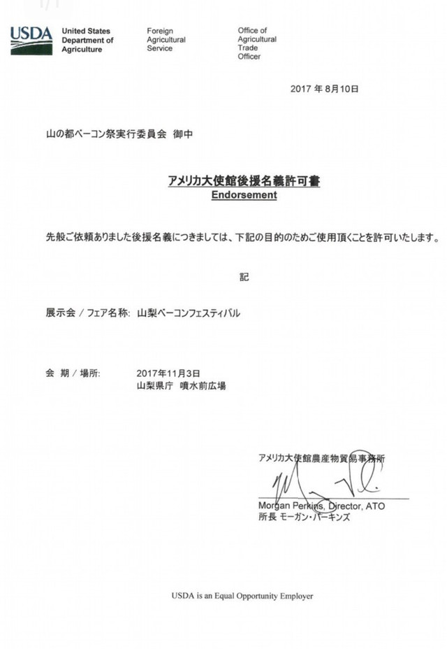 アメリカ大使館より、山梨ベーコンフェスティバルに対して正式に後援をいただきました。ますます盛り上がるベーコンフェスティバルを、是非ご支援下さい!