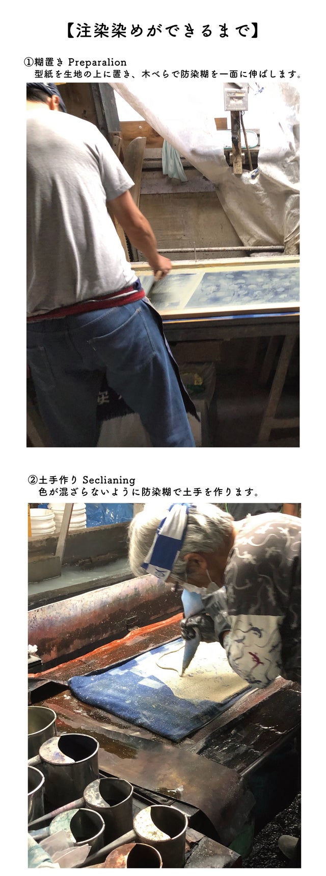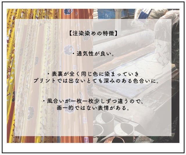 注染は1800年代明治時代からその始まりがあったとされる日本独自の染色技法です。染料のにじみや混合によるぼかしを活かして、豊な表情を持った深みのある多彩な染色が出来るのが特徴です。