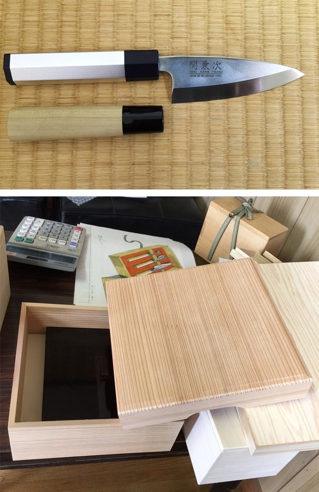 ◆まず、日本刀の伝統を受け継いでいる現代の刀匠を探す事からプロジェクトはスタートしました。刃物と言えば、世界的に名高い岐阜県関市があまりにも有名ですので、最初に関市に出向き、現代の刀匠を探す事から始めました。いろいろコンタクトを取り、話をさせていただくうちに関兼次(せきかねつぐ)を名乗る関兼次刃物株式会社に行き着き、社長さんも、「包丁は数え切れないぐらい作ってきたが包丁型のテーブルナイフなんか初めてだ。」と興味を示していただき、意気投合して一緒にやる事を決めていただきました。スプーンとフォークの製造はカトラリーの聖地、新潟県燕市の中でも、歴史的背景、品質の確かさ、美しさで郡を抜いた存在の名門、燕物産株式会社にお願いする事が出来ました。白木の箱は、山口県の業者さんにコンタクトを取ったところ快諾していただき、、カトラリーとしての統一性を図り、世界に発信するに相応しいデザイン・・伝統とモダンが融合した新しい『形』を目指しています。現在、細部にわたって検討し、完成度を高める段階に差し掛かっています。