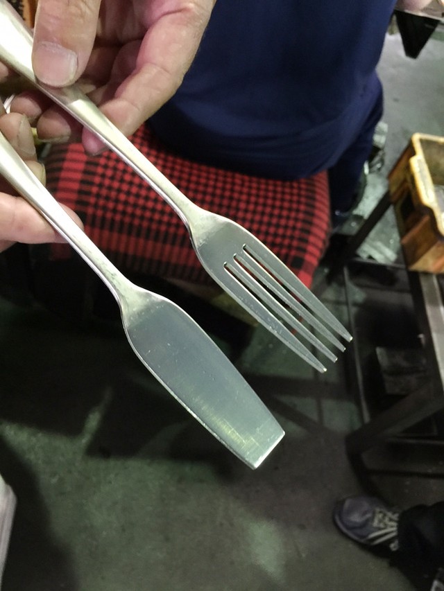 刀匠の伝統を受け継ぎ、現代に通用する刃物を創り続けている現代の関市の刃物の世界の第一人者です。その活躍のフィールドは、前衛的なデザインの刃物から、伝統に裏付けされた刃物まで幅広く、常に切れ味にこだわった刃物を創る姿勢はまさに現代の刀匠の名に相応しいと思います。無理をお願いして、今回やっとコラボレーションが実現しました。もともと関市とカトラリーの聖地、新潟県燕市とは歴史的に繋がりを深く、今回、関兼次の社長とスプーンとフォーク製造の100年続く、燕物産株式会社の社長とは旧知の間柄で、燕市で作るカトラリーを関市に運び、そこで最終的に完成品を作るという方法をとっていただく事にしました。