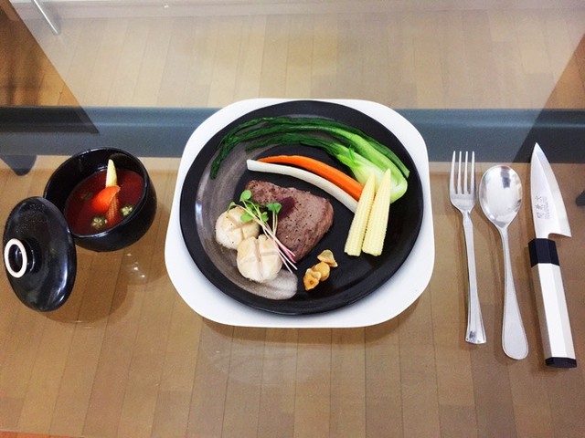 ◆メインの肉料理に包丁のカトラリーを用いたシーンです。違和感なく和テイストに溶け込んでいます。(注:今回開発中の『和のカトラリー』ではありません。)