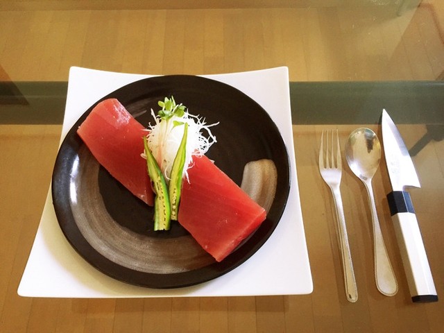 ◆今回、この『和のカトラリー』の開発にあたって、初期の段階では和のカトラリーを使って洋食を食する事が、何か妙なミスマッチ感があり、和風という味わい深い感覚で食事がする事が楽しいのではないか。という感覚だったのですが、開発を続けるうちに『全く新しい和食』の可能性を感じるようになってきました。今まで、和食とは箸で食するもので、その食材は箸で摘める範囲で小ぶりで美しく盛り付けられたスタイルが主流でした。現在開発中の包丁ナイフはとにかく恐ろしいぐらい切れ味が鋭く、刺身等は潰す事なくスパッと綺麗に切る事が出来ます。したがって、調理場で全ての料理を完成させるのではなく、料理を塊のまま食卓に提供し、食卓で洋食のように料理を自分の好みの大きさに切る事で、完成された和食から食卓で自分で完成させる『新しい和食』の可能性を感じるようになったのです。デリケートに対してダイナミック。受動から能動へ。食材は切ったその瞬間から『酸化』が始まります。理論的に口に入れる直前で切ったほうが理にかなっています。『和のカトラリー』が先にあって、その後『新しい和食』のスタイルが生まれ、もしかしたら、それが新しい食文化として発展し、定着したならば、こんなに嬉しい事はありません。伝統とは革新であり、チャレンジであると考えています。