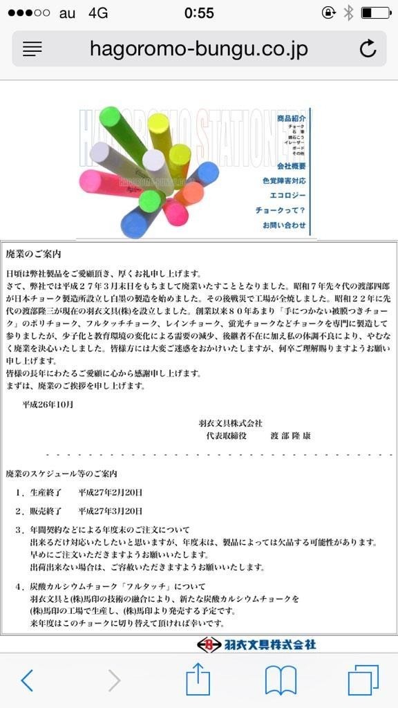 (↑文具のチョーク老舗も今年廃業: 羽衣文具HPより引用)
