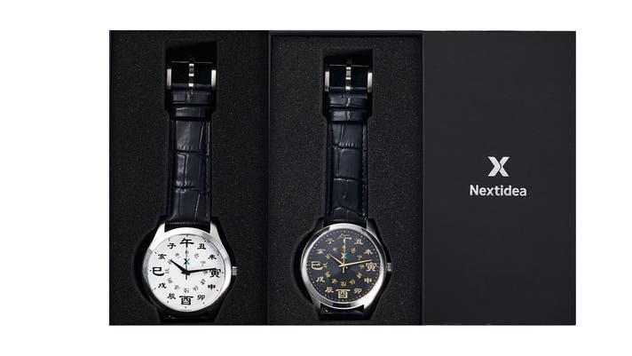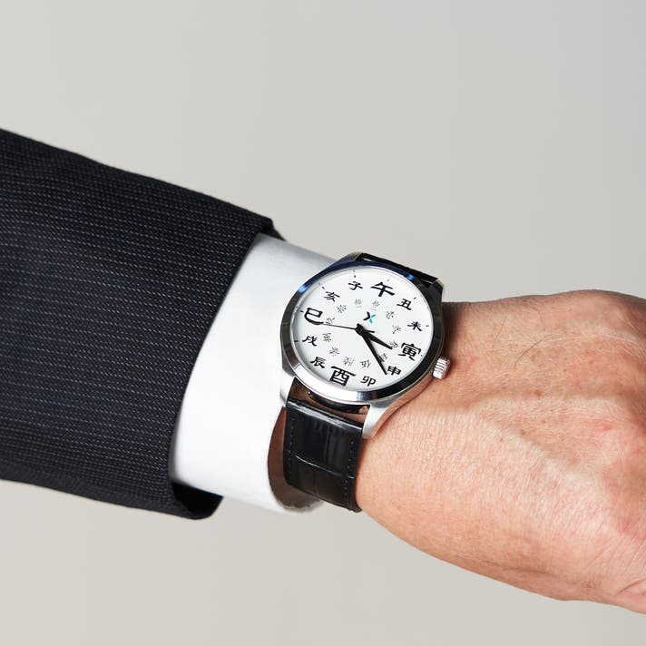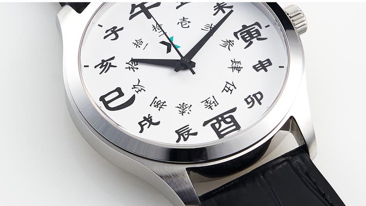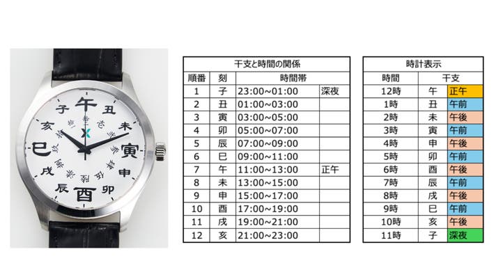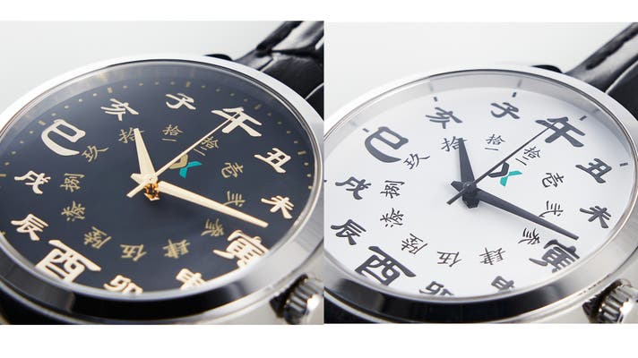 A. 本製品は、江戸の時刻を現代の12時間制で表現するため、「正午(午)」と「深夜(子)」、それぞれの対になる時刻を隣り合わせに配置した独自のデザインを採用しています。 12時位置の「午」を頂点に、1時・2時には「丑・未」...といった順で、時が流れる様子をお楽しみください。