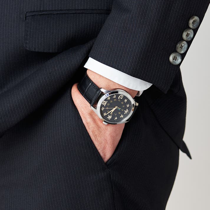 スーツやジャケットからさりげなく覗く十二支の文字盤。落ち着いた和モダンの個性が、商談や会議で上質な印象を与えます。