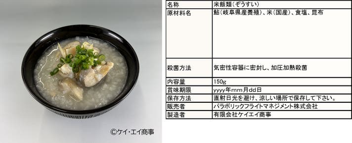 海なし県が誇るお魚、鵜飼漁法で有名な鮎を使った雑炊です。白身でふわふわの鮎をごろっとカット。宇宙空間でも食べやすく一口サイズに工夫しています。