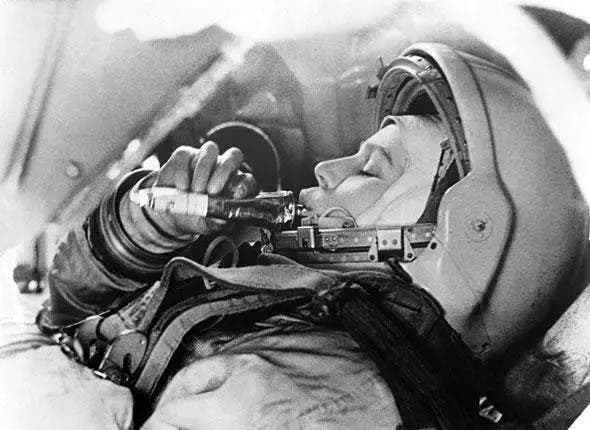 上:ボストークでチューブの食事をする旧ソ連の宇宙飛行士