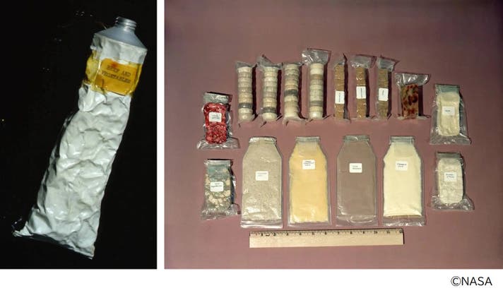 1961年、人類初の宇宙飛行士である旧ソ連のユーリ・A・ガガーリンは、初めて宇宙で食事をした人類でもあります。当時の宇宙食はアルミ製チューブに入った牛肉とレバーのペーストやデザートのチョコレートソースなどだったそうです。かたや5年ほど後のアメリカ航空宇宙局NASAによるマーキュリー計画でも、食事はチューブから栄養素を摂取するようなものでした。