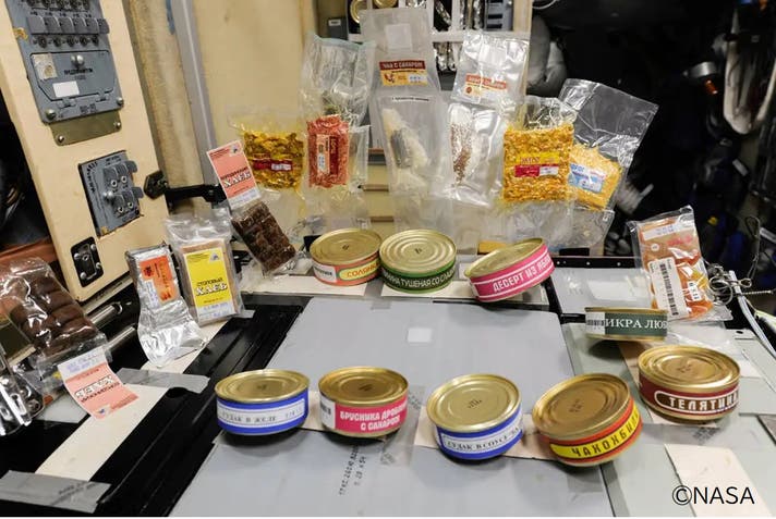 上:NASAの宇宙食 ISSズヴェズダサービスモジュールで食事の準備中