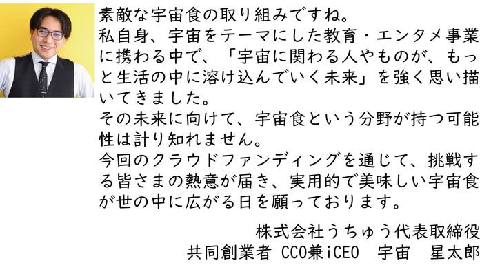 株式会社うちゅう 代表取締役 共同創業者 CCO兼iCEO 宇宙星太郎様より応援メッセージを頂きました!