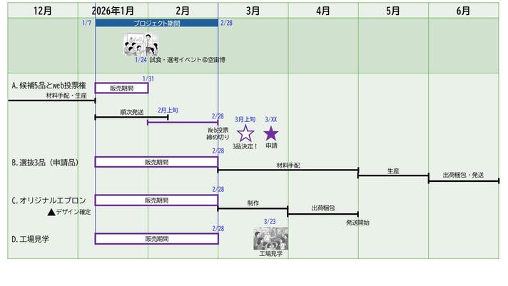 お届け開始は6月を予定しています。お届け商品は投票結果によるためご指定いただけません。予めご了承のうえ、ご購入いただきますようお願いいたします。投票結果は3月上旬にご購入者様にマクアケメッセージ機能で速報し、以降、活動レポートでも発表予定です。楽しみにお待ちください!