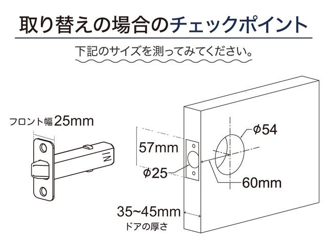 ラッチに IN、 OUT と表記されており、INを部屋の内側に向かって取り付けてください。フェイス・プレートのフロントにつけてラッチネジで締めてください。