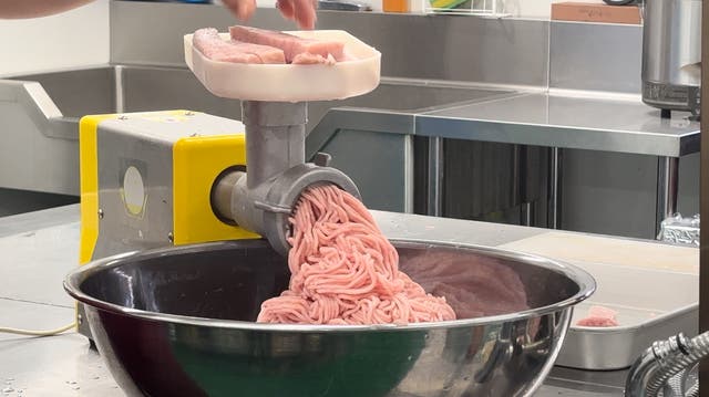 ①ブロックに切り出したモウカザメの切り身をミンチ機械にかけます。