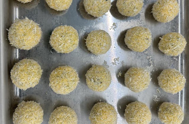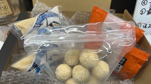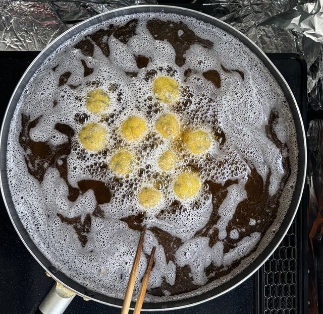 凍った状態のまま、180℃高温の油の中へ入れ、色目がでるまで箸で転がしながら揚げるだけ。