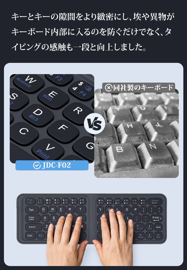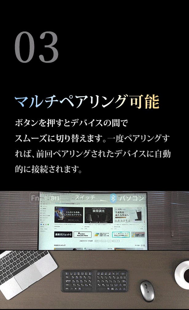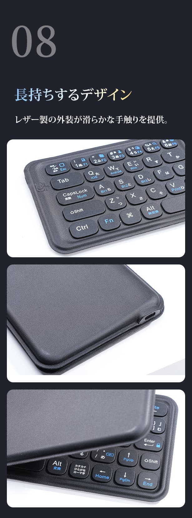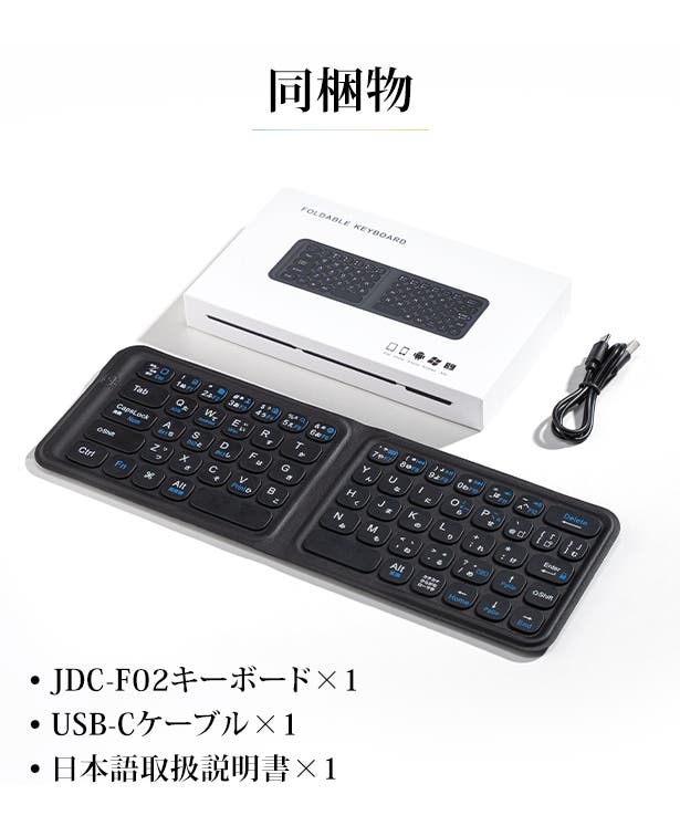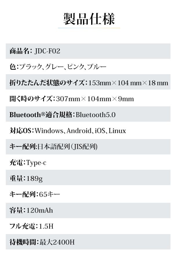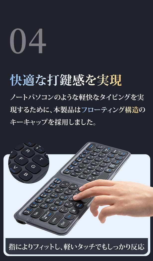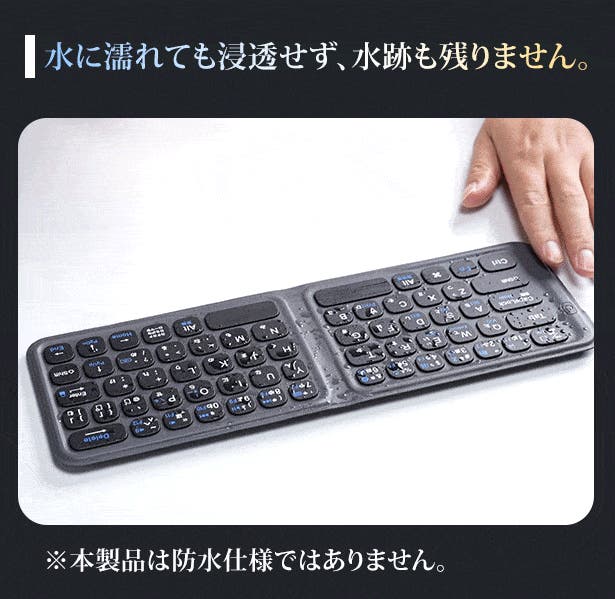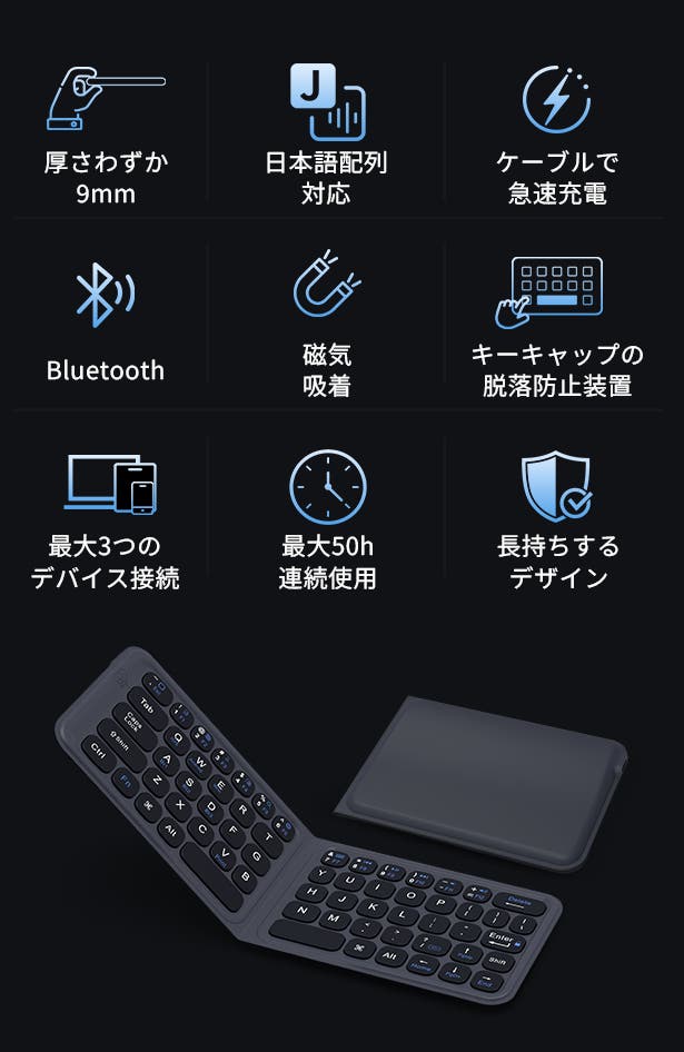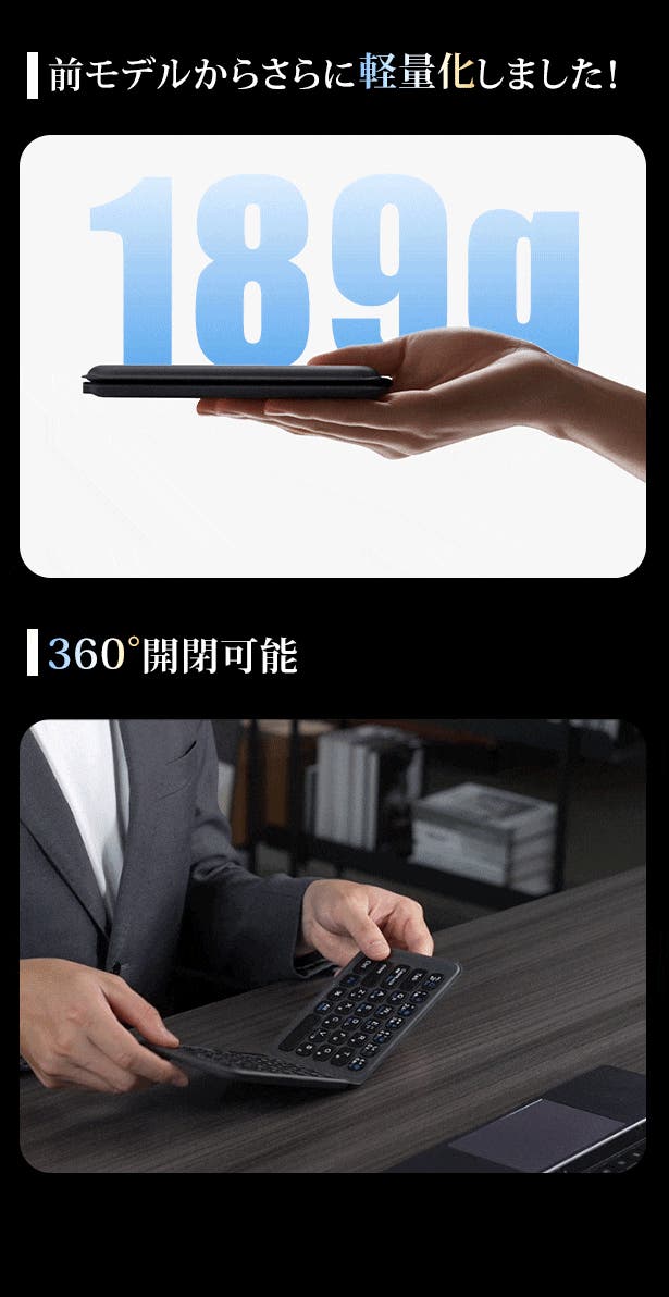 - 持ち運びに便利な厚さわずか9mm、重さが189gの薄型・軽量Bluetoothキーボードです。