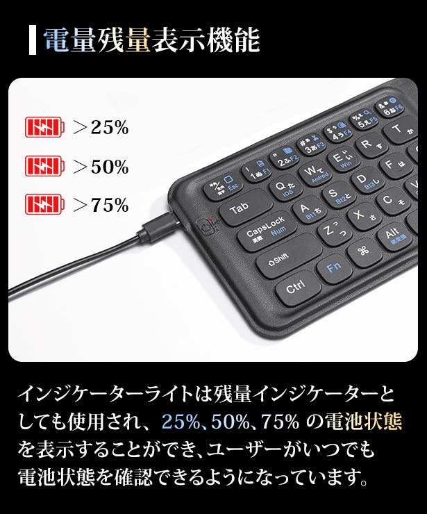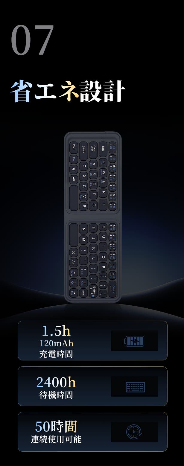 A2:充電なしの状態から約1.5hで満充電になります。製品には120mAhのバッテリーが内蔵されており、満充電の状態でキーボードは最大50時間使用できます。