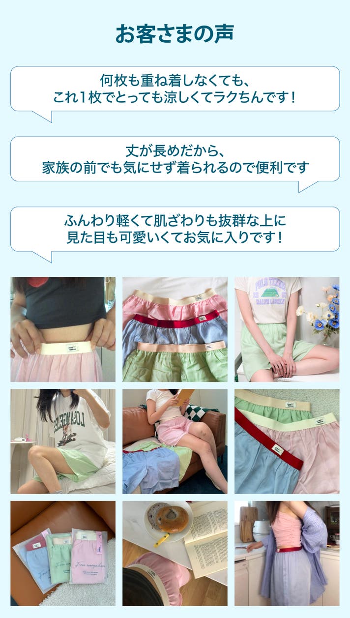 この商品を輸入しようと思った理由:夏の蒸し暑い時期は下着がムレやすく履き心地が悪いのが悩みでした。お家内だけでもムレずに快適に過ごせるものを探していたところ、このJennyショーツに出会いました。これ一枚でノーパンで過ごせて肌触りも良く涼しく過ごせるのでとても気に入っています。私のように、下着のムレや締め付けなどでお困りの女性の皆様にもご紹介したく、プロジェクトを実行することとなりました。