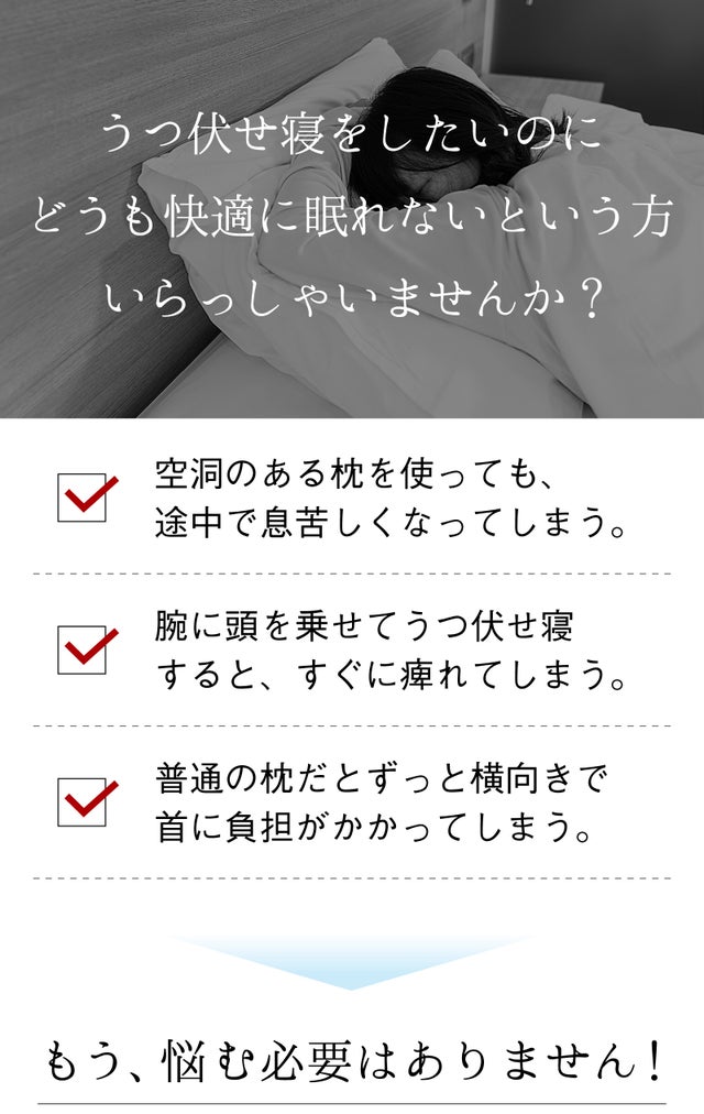 私には以前「うつ伏せ寝」をする必要があったのですが、どんな枕を使っても、寝ているうちに息苦しさを感じてしまい、快適に眠ることができませんでした。