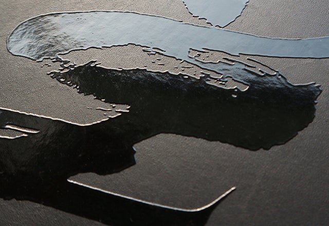 高橋酒造謹製 焼酎白岳「しろ」をご存知の方も多いと思います。そのロゴを揮毫した書画人 国崎幸子を妻とし、シルクスクリーン印刷業一筋35年の熟練職人である株式会社シルク・点字工房社長国崎満が長年温めていたアイデアを実行に移したのが2012年。それは「黒」をより黒く表現・印刷するという事。試行錯誤の末、黒い本牛革にシルクスクリーン印刷を施すという事にたどり着きました。