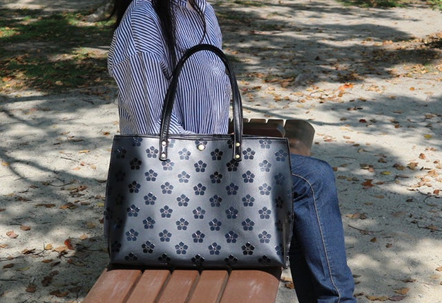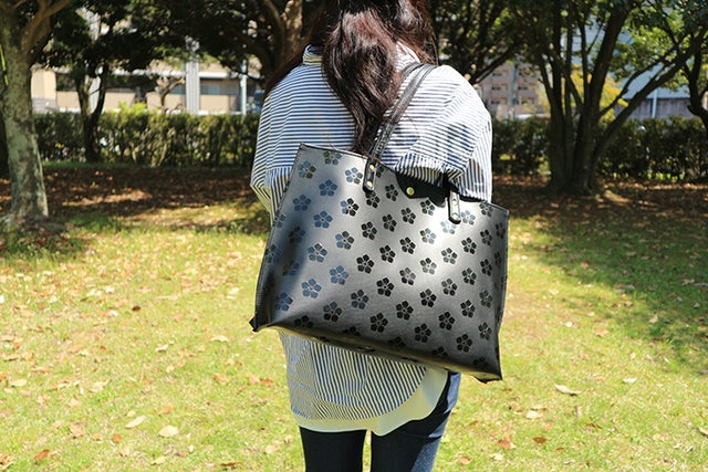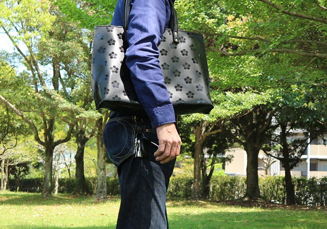 濡れた様な光沢の特殊印刷を施した国産本牛革トートバッグです。桔梗紋をあしらったシックなデザインに仕上げています。デザインは「桔梗紋」の他に「飛翔+龍」もお選び頂けます。