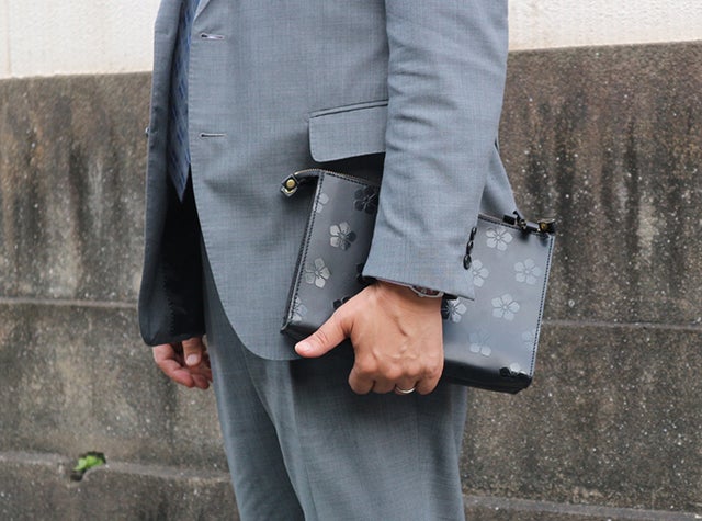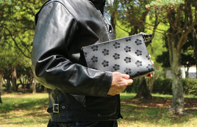 濡れた様な光沢の特殊印刷を施した国産本牛革セカンドバッグです。桔梗紋をあしらったシックなデザインに仕上げています。ダブルファスナーを採用し容量も十分に確保しています。