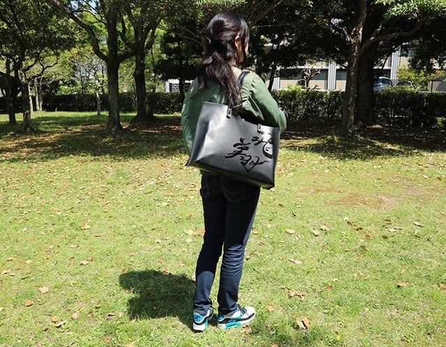 「飛翔+龍」は焼酎白岳しろのロゴを代表作とする書画人 国崎幸子の渾身の作品です。 バッグの裏面には黄金の龍をあしらいました。