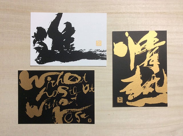 ポストカードは焼酎白岳「しろ」のロゴを書いた書家:国崎幸子による渾身の作品を3枚セットでお届けします。内容は「進」、「情熱」、 「ゲーテの詩(英文)」です。
