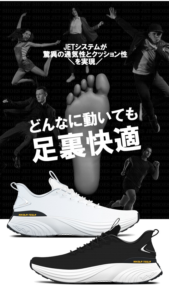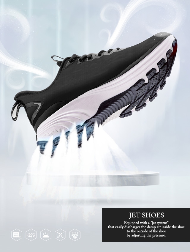 JETシューズは、優れた通気性とクッション性を兼ね備えた革新的なデザインのスニーカーです。シューズ内の湿った空気が圧力調整により簡単にシューズ外へ排出される「ジェットシステム」を搭載、今まで経験したことがない「爽快な履き心地」をあなたに。