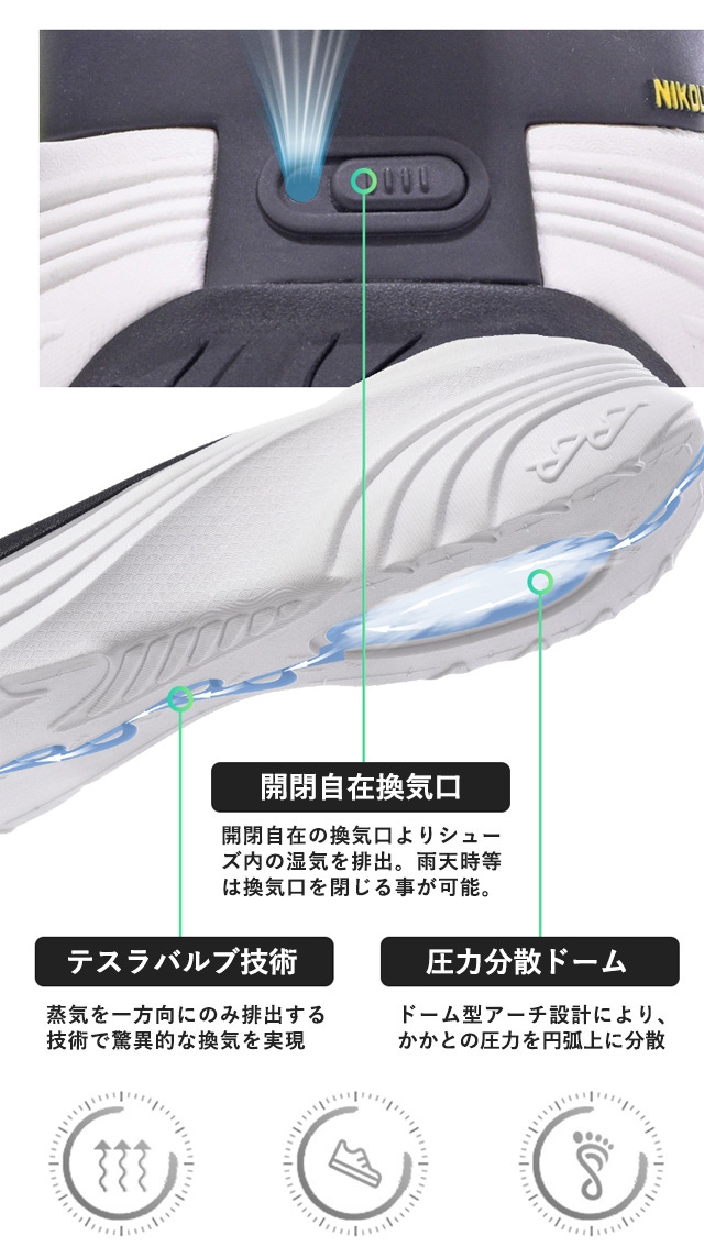 ニコラ・テスラが開発した特許技術「テスラバルブ技術」や最新のテクノロジーを集約、毎分40mlの蒸気を排気し靴の内部が360度循環通気状態に。