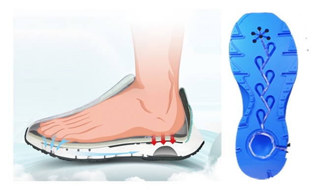 JET換気システムとは「圧力分散ドーム」と「テスラバルブ技術」による換気システムです。圧力分散により湿気を分散、テスラバルブ技術により蒸気を一方向のみに排出する事でシューズ内の通気性を24時間持続させます。