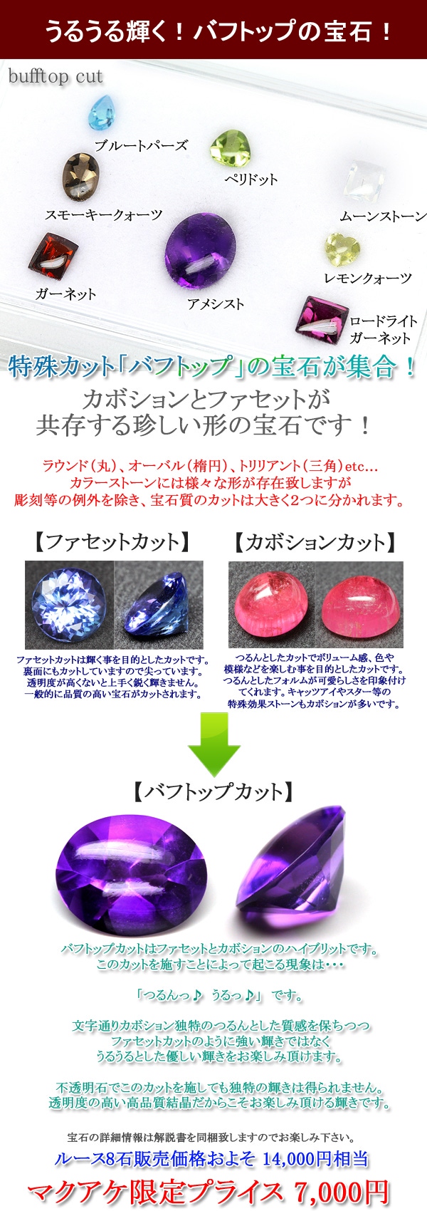 数あるカラーストーンのカットスタイル中でも施される事が少ない珍しいカットですので一挙に入手できる機会はあまりないかと思います。