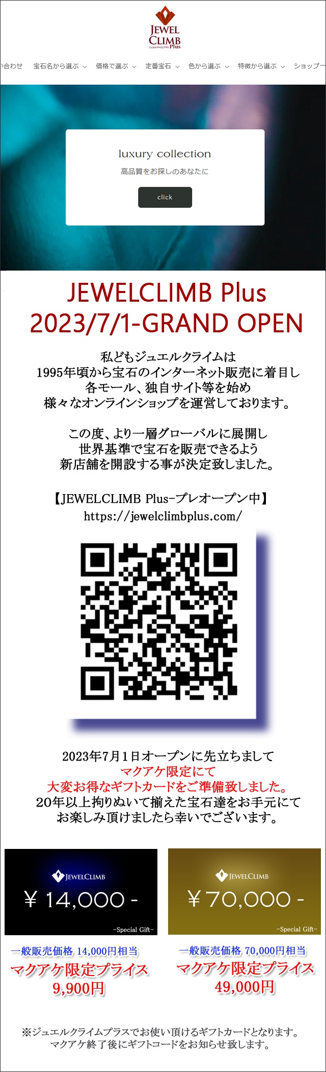 今回は7月にオープン致します「ジュエルクライムプラス」にてお使い頂けるお値打ちギフトカードやお得な宝石パックをMAKUAKE限定にてご案内致します。