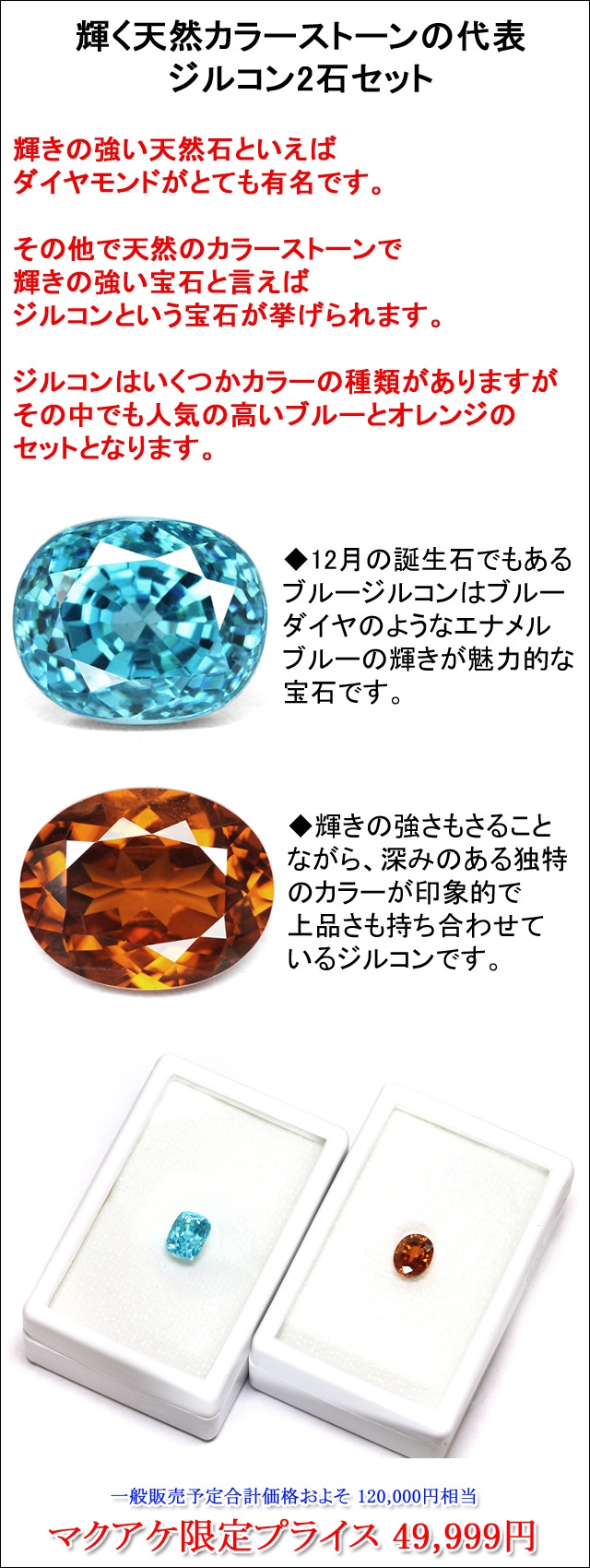 今回は4CTを超える大粒のブルージルコンと上品な輝きが美しいオレンジジルコンのセットとなります。どちらも強い輝きを放ちますので是非お楽しみ下さいませ。