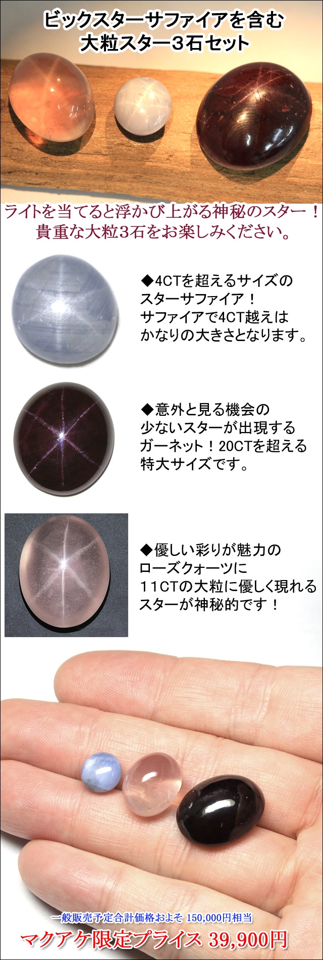 今回は大粒スターサファイアをはじめ、見た目にも迫力を感じさせてくれるスター石3種類をセットに致しました。