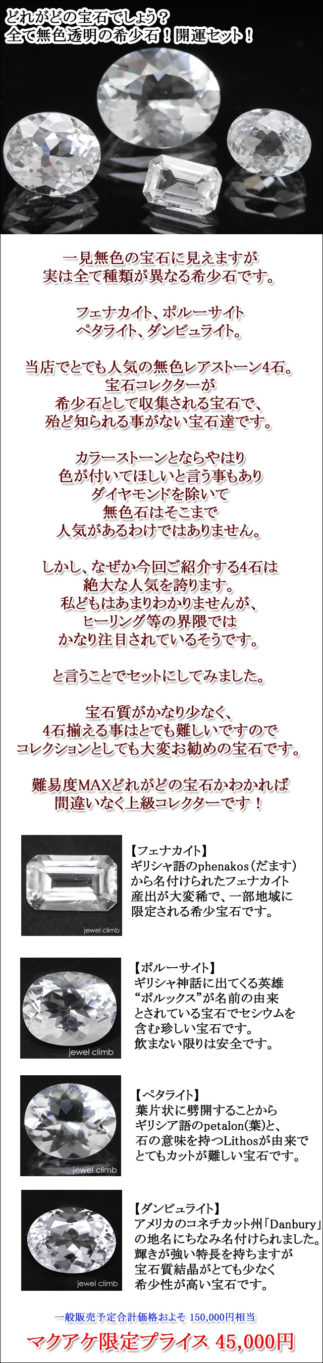 宝石コレクターが希少石として収集される宝石で、ジュエリー作成等を目的にとしては殆ど知られる事がない宝石です。しかもカラーストーンとならやはり色が付いてほしいと言う事もあり