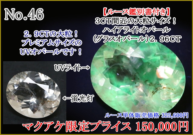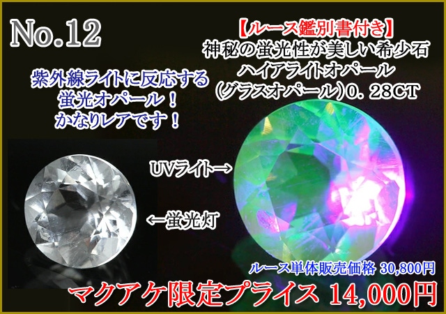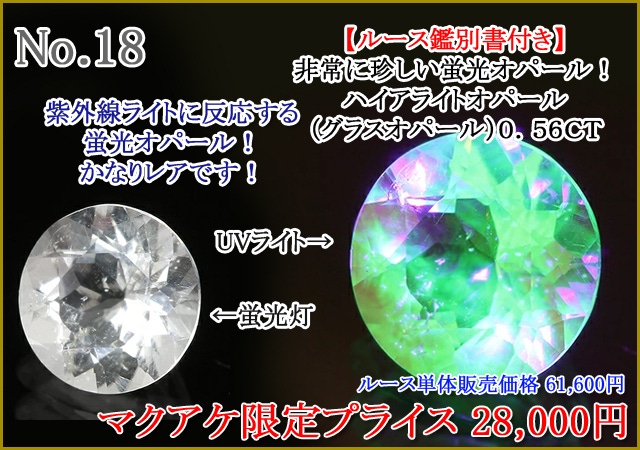 ガラス質なことからグラスオパールなどと呼ばれごく微量のウラン系の物資くを含むことにより短波動のブラックライトを照らすと蛍光します。